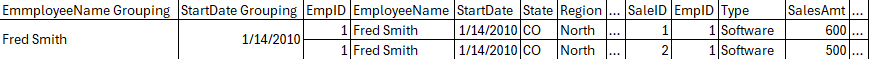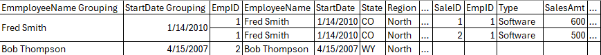 Notice how the two grouping fields at the start of the rows for Fred Smith are spanning the two “raw” data fields following them. This is starting to show how we are going to group values together in the final results. This also is starting to tell subsequent phases what will and what will not be allowed in those phases. For instance, it’s telling SQL Server that you cannot put Region in the SELECT clause, because we are not grouping by it (unless you are doing an aggregation on Region like MIN/MAX, of course). All the other non-grouped fields will still be eligible (which is why this phase’s result set still includes them, but they will only be eligible for certain parts of those phases.