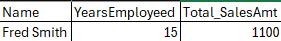 In our example, Bob’s record is going to drop off because he has no sales info. This is obviously a very simplified example, but you could see how it could still have many other records at this point. Note that we do not see any columns with that summed value of 1100 for Fred. This is because SQL Server does not necessarily need it. You can have fields/calculations in your HAVING that never actually make it to be presented to the user.