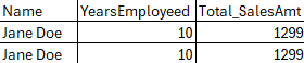 SELECT TOP 50 e.EmployeeName Name, DATEDIFF(Year, e.StartDate, GETDATE()) YearsEmployed, SUM(s.SalesAmt) Total_SalesAmt