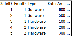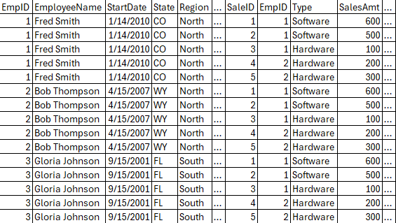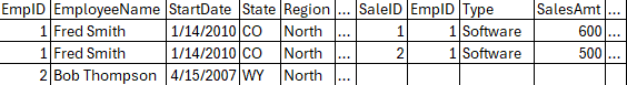 In our example, this will remove the “extra joins” of the cartesian join (where the EmpIDs don’t match). It will also only keep rows where the type is Software. As you can see below, this means we have both SalesTable rows for Fred since they are Software, but then for Bob and Gloria we see nothing from SalesTable. But we do still see their data from the EmpTable since we have a LEFT JOIN.